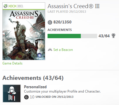 Also played a little Assassins Creed III 3 online, gained 2 online levels, but got no achievements.