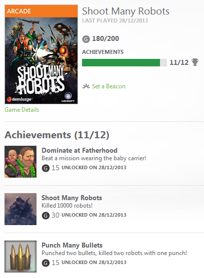 In Shoot Many Robots I did some grinding and got the "10000 kills" achievement. I must say, I was somewhat lucky today with the other 2 achievements. Punching bullets is not my thing, I tend to jump around and trying to avoid them altogether, but somehow I managed to be at right place at right time. Similar lucky break came with the Fatherhood Domination achievement - finding the baby carrier in one of the loot boxes ... could of taken a lot of time.