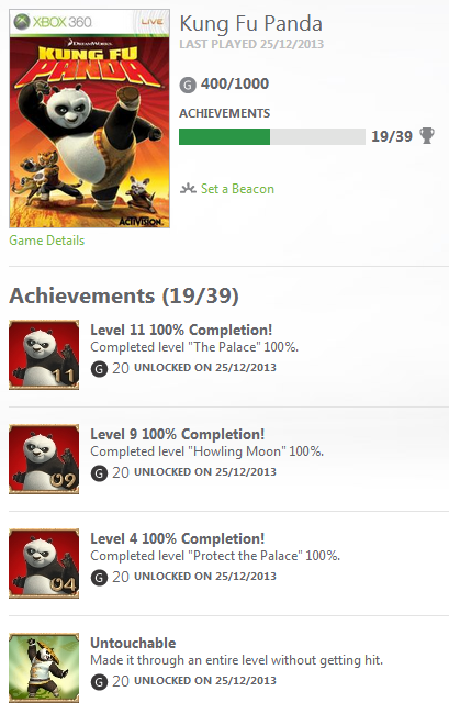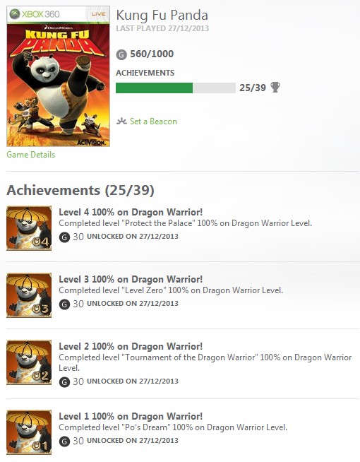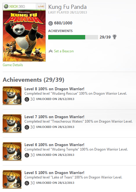 Today played a lot of Kung Fu Panda and got 4 achievements in the game. +80 GS