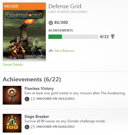 Last but least - decided to fire up again one old but good arcade game - Defence Grid. It's a game I have not played for long time - last achievement in the game was from 2nd February 2012.